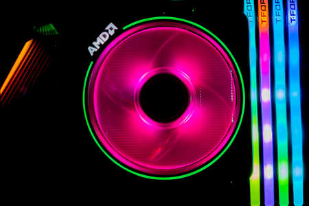 LOS ANGELES, USA 25 APRIL 2021: Gaming pc interior detail illuminated with rgb fan