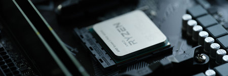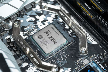 Fujiang, China - February 17, 2020: Close-up of AMD Ryzen 3000 Series CPU on motherboard. It is a high-performance microprocessor introduced by AMD in 2019.
