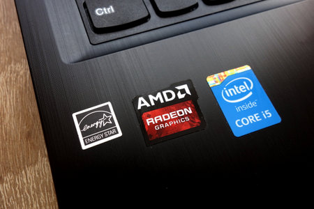 KONSKIE, POLAND - MAY 06, 2018: Personal computer with stickers: Energy Star, AMD Radeon Graphics and Intel Core i5
