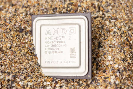 Timisoara, Romania - October 17, 2020: Close-up of an AMD-K6-2/450AFX processor, 333 MHz, Socket 7 with sand in the background.