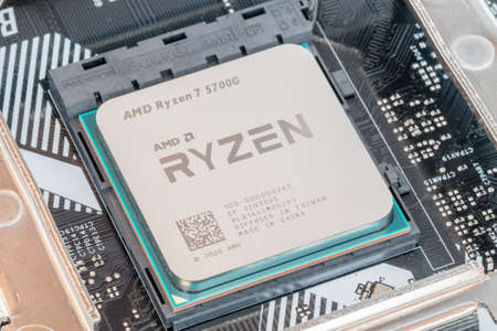 Pruszcz Gdanski, Poland - April 21, 2022: AMD Ryzen 7 5700G CPU in AM4 socket on motherboard.