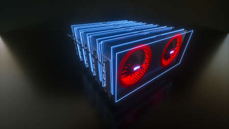 several video cards highlighted with blue neon light on a black background. crypto farm concept. mining cryptocurrency. 3d render illustration