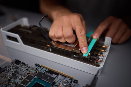 Electronic engineer of computer technology. Maintenance computer cpu hardware upgrade of motherboard component. Pc repair, technician and industry support concept.