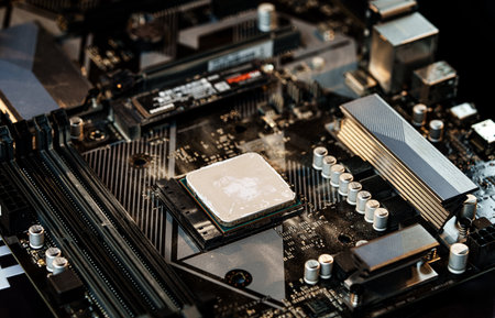 CHIANGMAI, THAILAND - MAY 23 2021 : Close-up AMD Processor on Computer Motherboard.