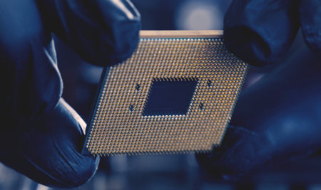 Computer processor in hand without gloves on the background of the motherboard before installation. The concept of home PC assembly, self-repair and computer upgrade.