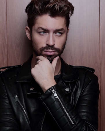 Black-and-white portrait of a handsome brunet man in black leather jacket standing by a stone wall.