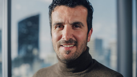 Portrait of Thoughtful Businessman wearing Minimalistic Stylish Turtleneck Standing in Office, Turning and Looking at Camera. Successful Corporate CEO, Top Investment Manager, Social Media Strategist