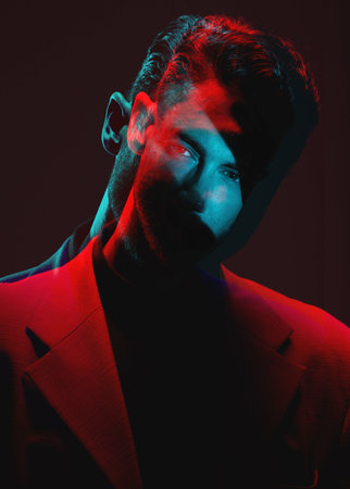 Art, neon light blur and portrait of man with reflection of lights in eyes in with serious expression on face. Futuristic fashion, male model and beauty with red and blue on dark studio background.