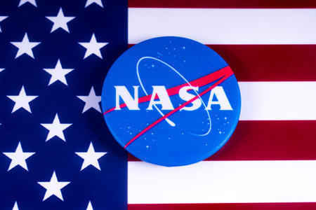 LONDON, UK - MARCH 18TH 2018: NASA badge pictured over the USA flag, on 18th March 2018. NASA is the independent agency of of the US federal government responsible for the civilian space program and aerospace research.