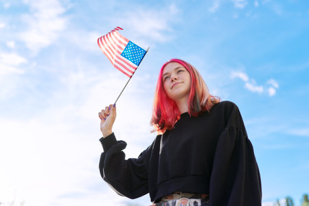 Female student teenager with USA flag in hand, blue sky with clouds background. United States of America, education and youth, patriotism people concept