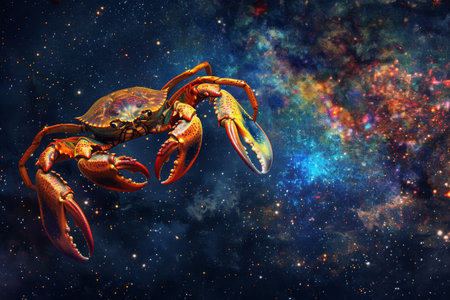 Cancer Zodiac Sign, Crab Horoscope Symbol, Magic Astrology Lobster, Crayfish in Fantastic Night Sky, Copy Space, Generative AI Illustration