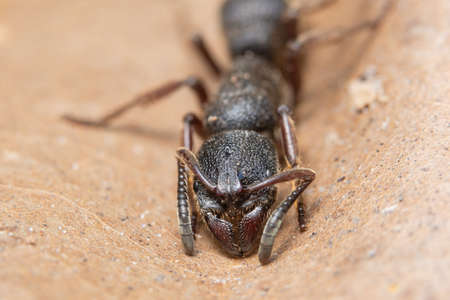 Close up face of black ant on tree branch, Selective focus.