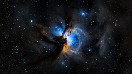 A cosmic nebula with swirling clouds of gas and dust.