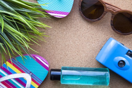 Preparing for vacation, travel or journey. Travel planning. Booking hotel. Sand background with slippers, sunglasses, passport, seashells, camera and compass.