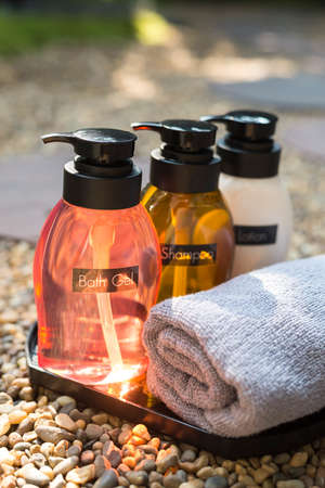 (Blank Label) Mini bottles with cosmetic products and towels beside swimming pool against sun light. Hotel amenities such as hair shampoo, hair conditioner, body wash and body lotion