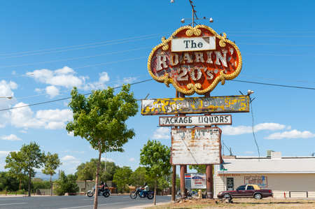 Grants USA - September 20 2015; Historic Route 66, neglected tatty vintage Roaring 20s liquor store sign. New Mexico, USA.