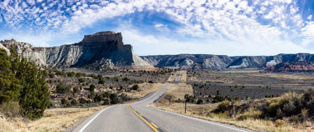 Panoramic View of a scenic route surrounded by mountains in the desert. Colorul Blue Sky Art Render. Taken on Route 12, Utah, United States of America. Adventure Background Panorama