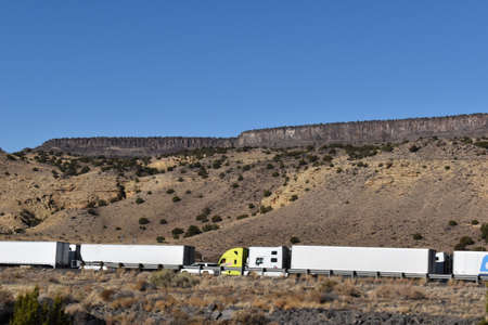 Rocky Desert Utah Highway with Semi Trucks. Scenic Utah Interstate Highway I-70. United States.