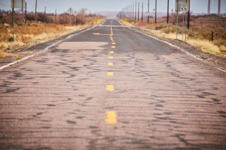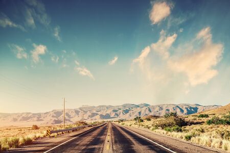 Route 66 classic old road in desert and mountain scenery in the USA. Vintage tone