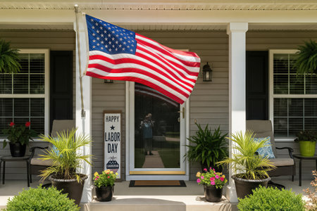 A suburban house decorated for Labor Day features an American flag waving in the wind. A sign with Happy Labor Day stands on the front porch surrounded by potted plants. The image is brightly lit with a festive and patriotic mood.