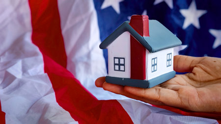 A hand holding model house with background of usa flag.