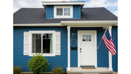 House with American flag on blue wall isolated on white background, USA