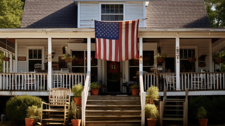 Porch of a house with the USA flag in front. High quality generative ai