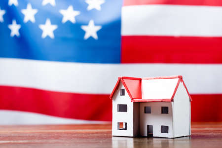 Small wooden house and USA flag, sky on background. Real estate concept, copy space