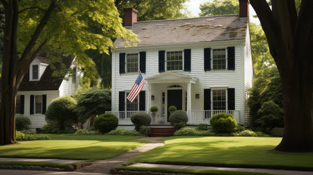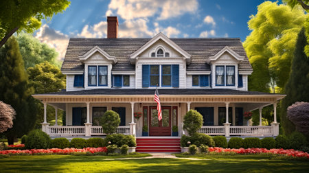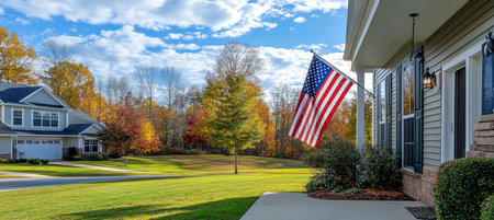 Traditional Two-Story House with American Flag on the Porch. Fall Landscape, Sunny Day.