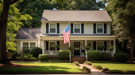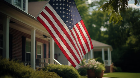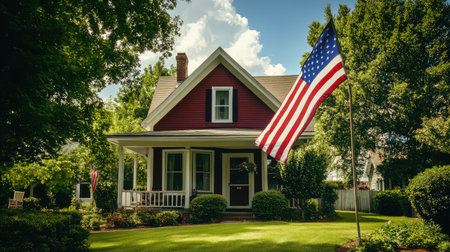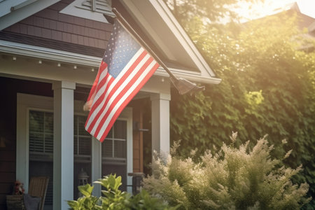 A vibrant American flag flutters proudly outside a cozy suburban home surrounded by lush greenery in the warmth of a sunny afternoon.
