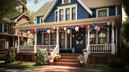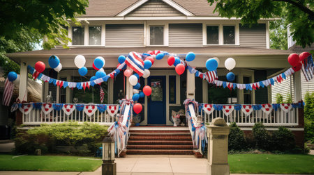 A traditional American front porch decorated with flags, a patriotic wreath, and potted flowers, perfect for Independence Day or Memorial Day visuals.