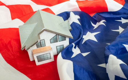 Real Estate Concept. Living House over American Flag extreme closeup. 3d Rendering
