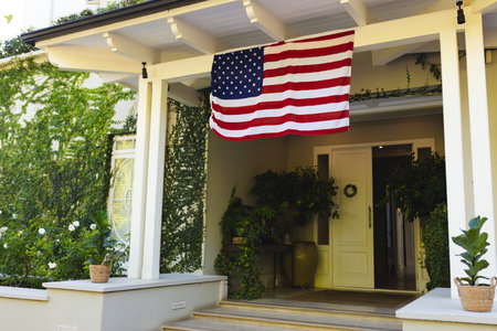 General view of house entrance with flag of usa hanging from roof. American flag, patriotism and domestic life.