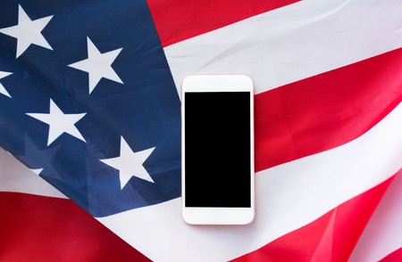 technology, american independence day, patriotism and nationalism concept - close up of smartphone with black blank screen on american flag