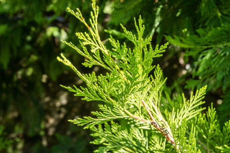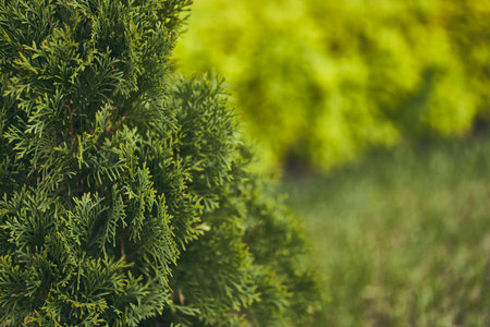 Close-up photo of thuja bush in the summer season, selective focus, copy space
