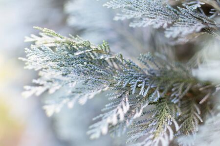 Close up top view of thuja branches. Selective focus. Abstract background.