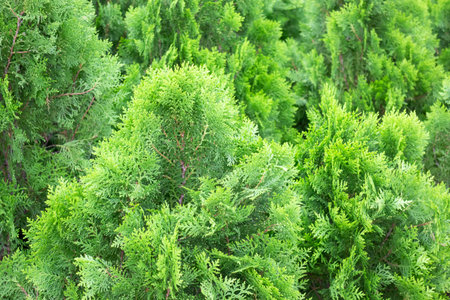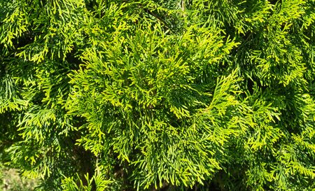 Lush foliage of vibrant evergreen thuja close up. decorative shrub. Cypress shrub growing in the garden. Natural coniferous background for postcard or cover.