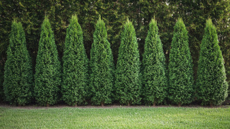Row of thuja trees at white wall background. Green hedge. Empty place for text, copy space