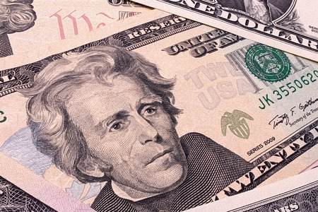 close-up of a detail of American dollars with a portrait of the President, face value of twenty dollars, genuine money