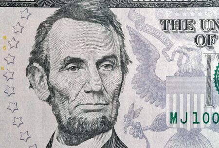 Portrait of US president Abraham Lincoln from five dollars bill new edition macro
