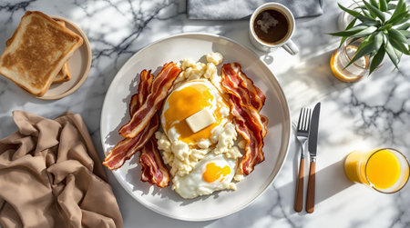 An overhead view of a delicious breakfast spread, featuring crispy bacon, scrambled eggs, and toast on a white table, creating an inviting atmosphere for morning meals.