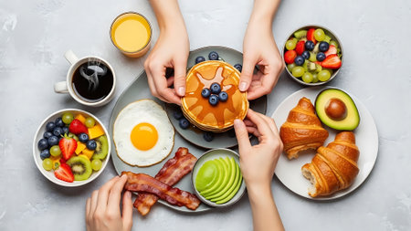 A creative flat lay of an American breakfast with a fluffy omelet, crispy bacon, hash browns, and toast.