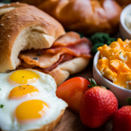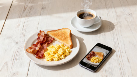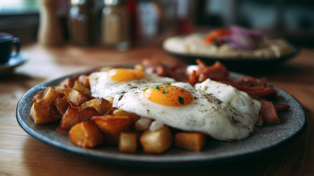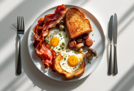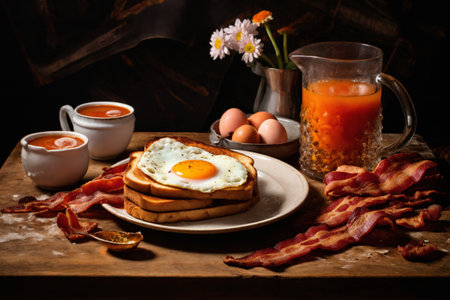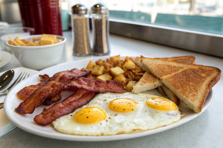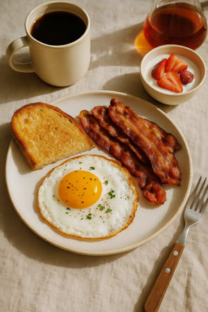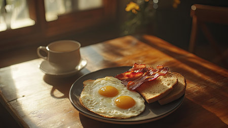 Sunlight filters through the windows of a cozy cafe, illuminating a well-laid table. A plate adorned with crispy bacon and perfectly cooked sunny-side-up eggs sits at the forefront, inviting all who gaze upon it. Golden toast complements the dish, while fresh fruits and a delicate flower arrangement add charm to the setting. Sipping warm coffee or tea completes this delightful morning ritual, where flavors dance and mornings are celebrated in warmth and comfort.
