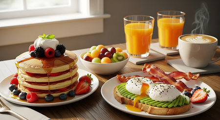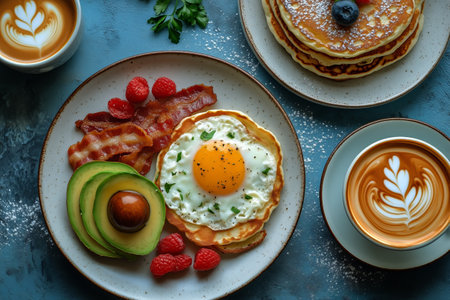 A delightful breakfast featuring fluffy pancakes topped with syrup, sunny-side-up eggs, crispy bacon, and fresh avocado served with coffee in a cozy environment.