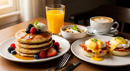 Delicious breakfast of pancakes, eggs, and bacon served in a cozy diner setting during morning hours