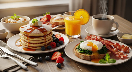 A hearty breakfast spread featuring pancakes, bacon, a fried egg, coffee, orange juice, and yogurt with granola on a wooden table.