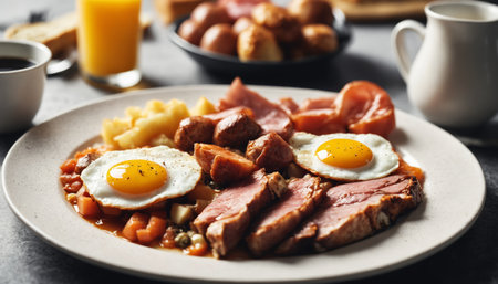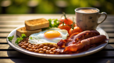 A hearty Full English Breakfast with crispy fried eggs, sausages, bacon, grilled tomatoes, hash browns, and beans, all perfectly cooked and garnished for a classic indulgent meal, traditional English