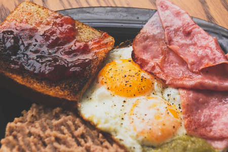 Photograph of a pair of fried eggs with beans, jam and bread with jam