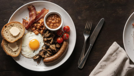 An overhead shot of a classic full English breakfast featuring a fried egg, crispy bacon, a grilled sausage, baked beans, sauteed mushrooms, cherry tomatoes, and buttered toast, served on a white plate with cutlery on the side.