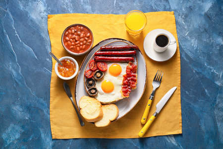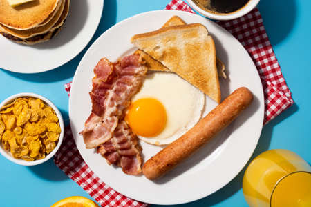 Traditional American breakfast with fried egg, toast, bacon and sausage on blue background